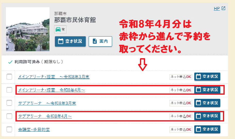令和8年4月分以降の那覇市民体育館インターネット予約について次のとおり一部システムの改修を行いました。